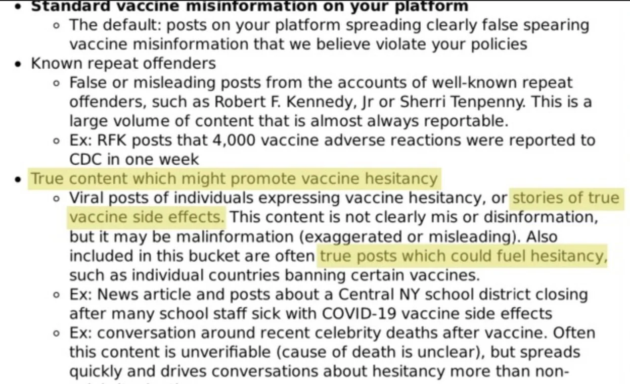 o The details of this are honestly hard to sus out. There were some shady government cutout organizations, working with academic centers, which would report thousands of tweets, facebook posts, google searches. Policies were in place to suppress any information critical of the vaccine. It made it incredibly difficult to find information other than what the government who failed in all the above ^^^ was putting out. In the background the government was pushing for suppressing true information which they judged would lead people to the wrong conclusions.