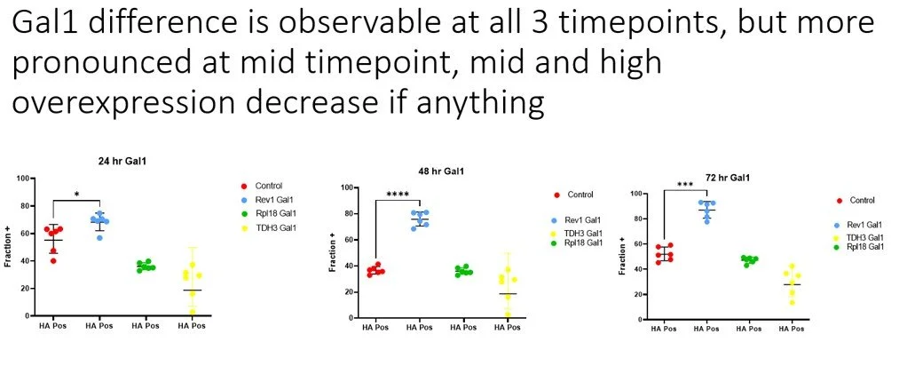 This is where things got weird. I found that overexpressing one element (gal1) of the galactose memory pathway would increase the induction dramatically compared to no overexpression, but only when the genomic integration Gal1 and nanobody plasmid were co-transformed. If the integration cassette was introduced prior to the transformation of the nanobody construct, then it would not increase display. I also tested Gal 2, 3, 4, 10, with the same set of 3 promoters, and those did not increase display.